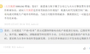 日前,有投资者向上汽集团提问称,“赛力斯下属子公司已与火山引擎签署具身智能业务合作框架协议,请问上汽集团是否有类似的合作规划?”。 图片来源: 互动平台截图 对此,上汽集团于今日(...