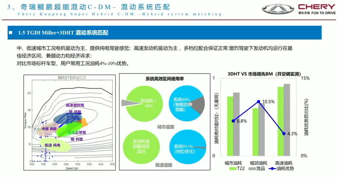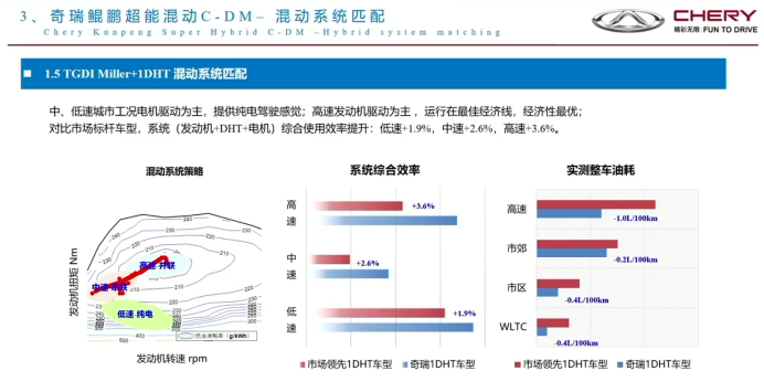 我们的系统效率具备极大的竞争力,尤其是在高速工况下,高速工况和我们发动机的最高效率区间是完全匹配的。在市郊、市区以及WTC工况下,同样具备明显的优势。