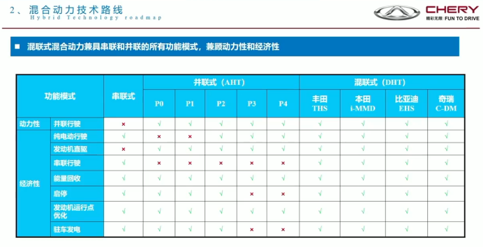 就并联的混动而言,P2是比较好的构型,欧洲几个主机厂都在开发,以满足欧洲200km/h以上的车速要求。如果是面向普通客户,能够大批量生产,技术分析认为性价比最高的方案是DHT的技术路线,奇瑞选择的技术路线是混联DHT。