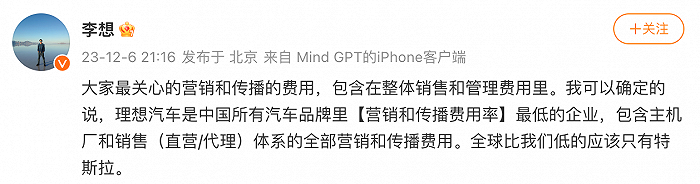 12月7日,盖世汽车获悉,理想汽车CEO李想发文称:“我可以确定的说,理想汽车是中国所有汽车品牌里营销和传播费用率最低的企业”,“全球比我们低的应该只有特斯拉”。