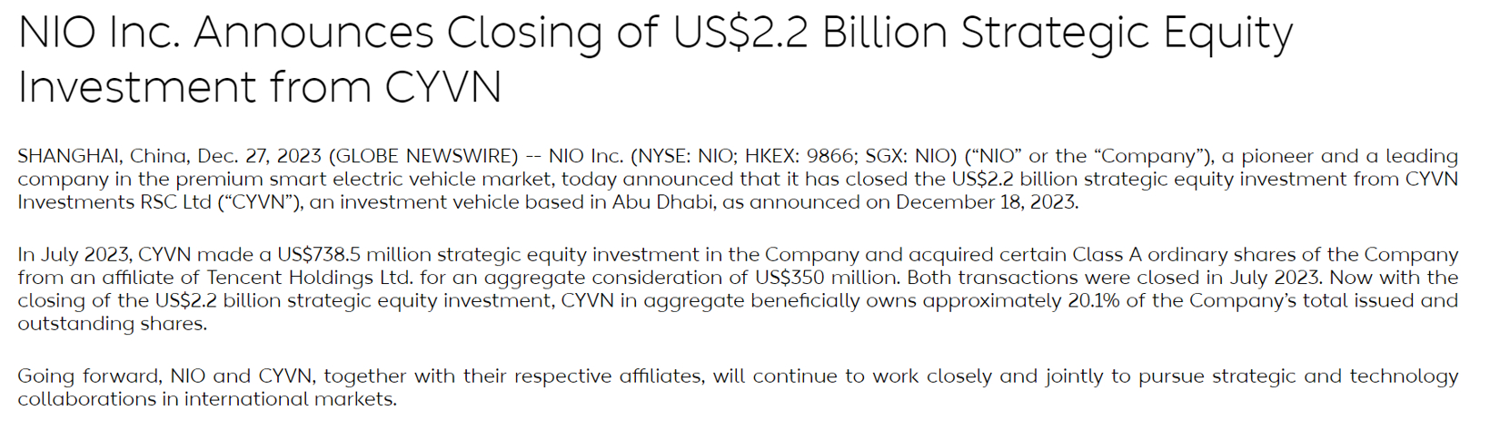 12月27日,蔚来在官网宣布,其已完成于2023年12月18日公告的来自总部位于阿布扎比的投资主体CYVN Investments RSC Ltd(CYVN)的22亿美元战略性股权投资。