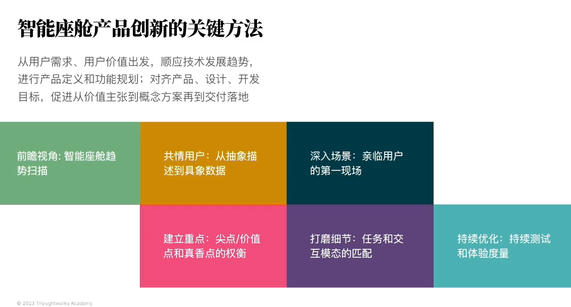 2023年12月13日,在2023第五届智能座舱与用户体验大会上,Thoughtworks中国区设计总监马彦青表示,在智能座舱的发展趋势下,我们需要通过6大关键方法实现的体验的系统性提升和持续追踪。