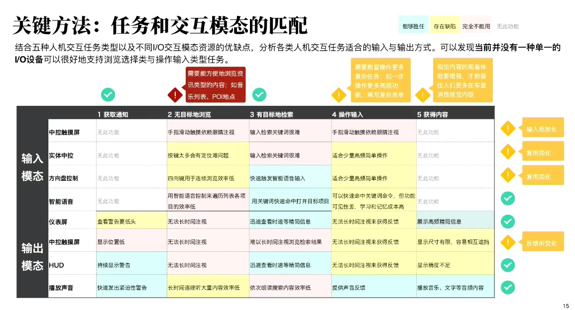 谈到智能座舱,我们都会想到多模态。下图横轴是用户在座舱任务中的类型,包括获取通知、无目标浏览、有目标地检索、操作输入和获得内容。纵向分为输入模态和输出模态,颜色代表不同交互资源的优劣势和胜任能力。