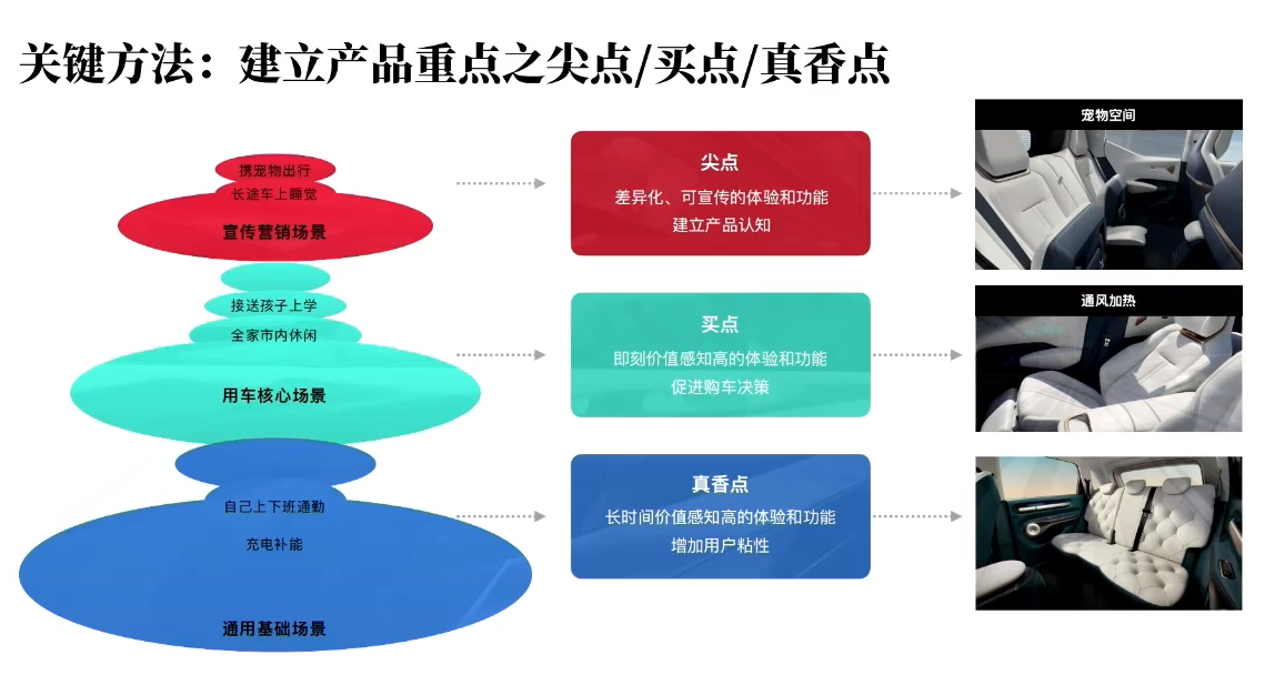 建立产品重点时,我们不能忽略真香点,比如自动驾驶或辅助驾驶的功能是用户用了之后回不去的功能。我们在做产品创新时会提出非常细腻的、能够为用户提供极大价值的点,但在购买决策环节中很难体会到,但却可以通过长时间的使用体验,逐渐体会到这样的细腻设计,并形成新的购买决策的标准。