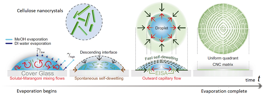 图1. 该概念图像显示均匀象限纤维素纳米晶体(CNC)基质形成的流体动力学机制。(图片来源:KAIST)