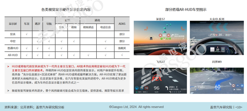 AR-HUD具备“充分信息展示+沉浸式体验”的特点,将成为更多信息的显示载体,成为车内信息显示最主要方式之一。随着技术成熟和成本下降,AR-HUD呈现出向主流大众市场渗透的趋势