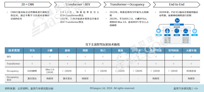 在感知算法上,目前头部车企都选择跟进特斯拉的算法的迭代方式,当前头部车企在BEV+Transformer+ Occupancy基础上不断优化体验,特斯拉2024年初将实现端到端技术的落地