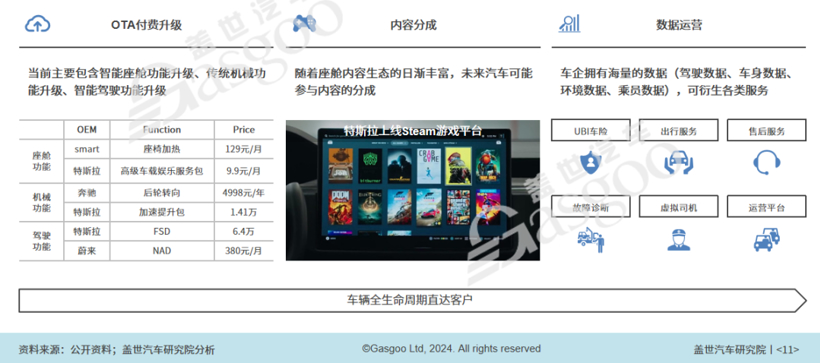 除了当前的OTA付费升级模式,车内丰富的内容生态,也可以成为车企巨大的收入来源;同时,未来的智能汽车将成为继手机之后的最重要的移动数据收集终端,通过收集大量的数据衍生出多类业务模式