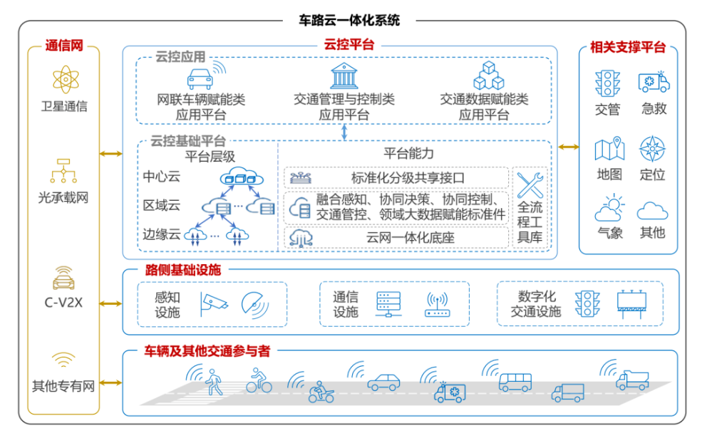 所谓”车路云一体化”,顾名思义是利用新一代信息与通信技术,将人、车、路、云的物理层、信息层、应用层连为一体,进行融合感知、决策与控制,从而实现车辆行驶和交通运行安全、效率等性能的全面提升。