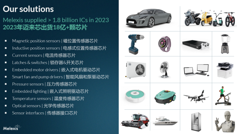 目前,迈来芯的传感器和驱动器产品组合包含磁位置传感器、电感式位置传感器、电流传感器、锁存器开关、嵌入式电机驱动芯片、智能驱动芯片、压力传感器、胎压监测传感器、温度传感器、光学传感器、传感器接口以及嵌入式照明驱动芯片,广泛覆盖汽车动力总成、热管理系统、电池、电子制动、电子转向以及汽车照明等关键领域。
