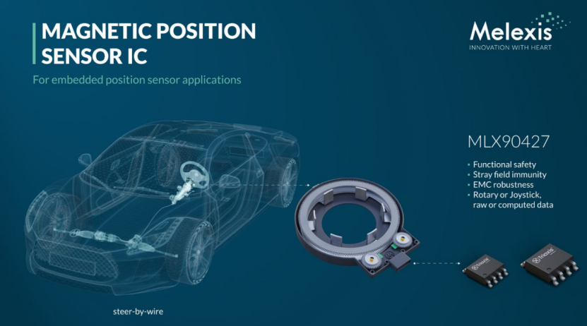 比如迈来芯Triaxis®系列最新推出的产品MLX90427,单芯片可以达到ASIL C安全等级,芯片内置杂散磁场干扰免疫,增强了EMC特性,适用于线控转向的方向盘转角传感器。