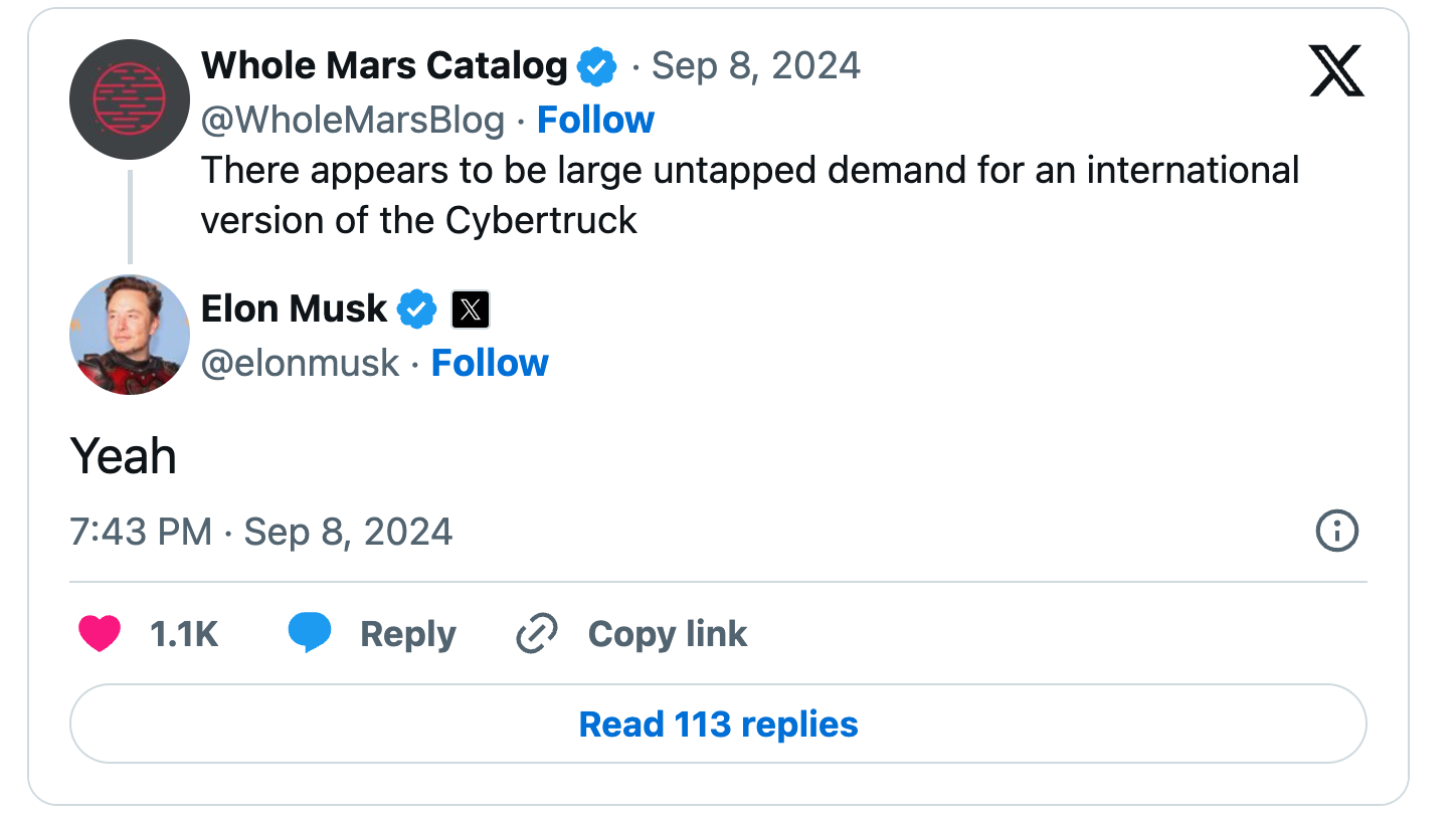 无论采用哪种方法,马斯克都认为Cybertruck都需要新的开发方式来满足国际市场。有粉丝在社交媒体X上表示:“国际市场似乎对国际版Cybertruck有着大量需求,而这些需求尚未开发。”随后马斯克回应道:“是的。”