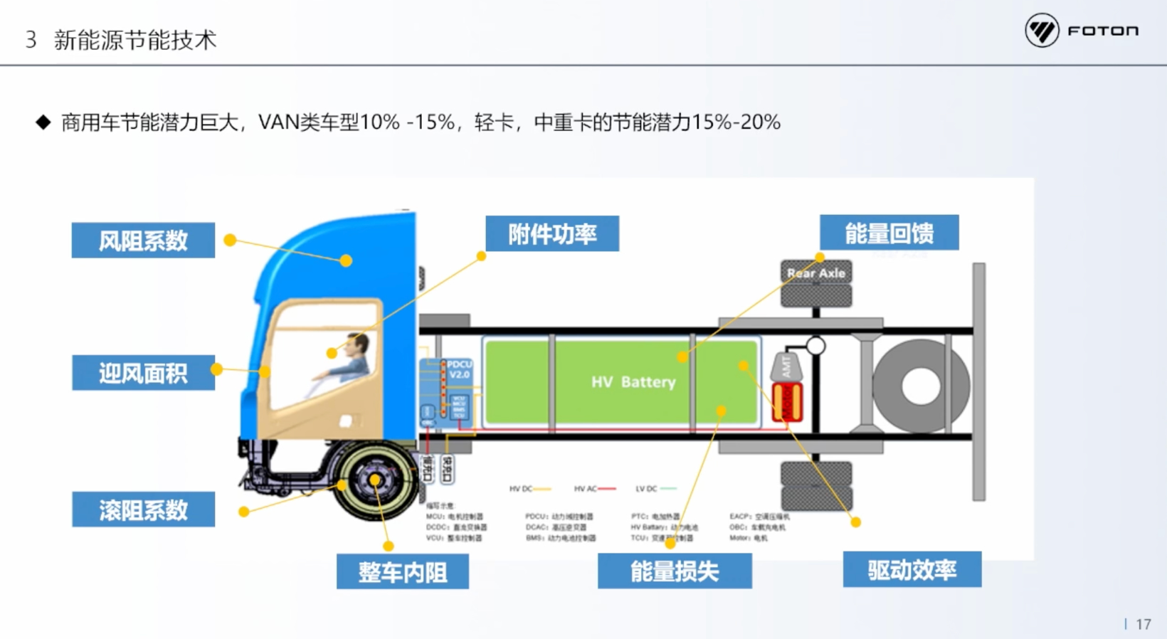 以下是一个轻卡节能技术的简要图示案例。未来,车身或驾驶室的设计将发生显著变化,流线型造型的应用,有望将风阻系数降低至0.4以下,这预示着巨大的节能潜力。同时,我们一直在对节能路线3.0进行评估,预计2030年相较于当前能耗的降低幅度可以达到10%-15%。