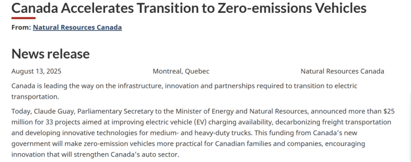 文章来源于互联网:加拿大斥资逾2,500万加元用于电动汽车基础设施建设
